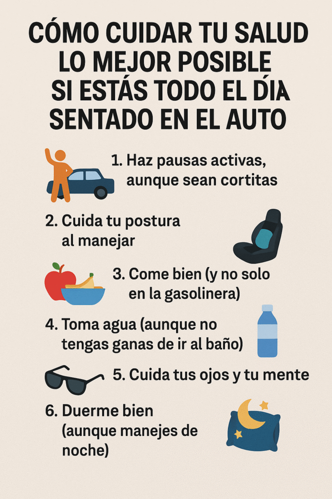 Ser conductor tiene sus ventajas, pero también trae varios retos para la salud, especialmente cuando pasas muchas horas al día sentado en el coche. Aunque no lo parezca, el cuerpo se resiente. Aquí te damos algunos consejos prácticos para cuidar tu bienestar sin dejar de chambear.
